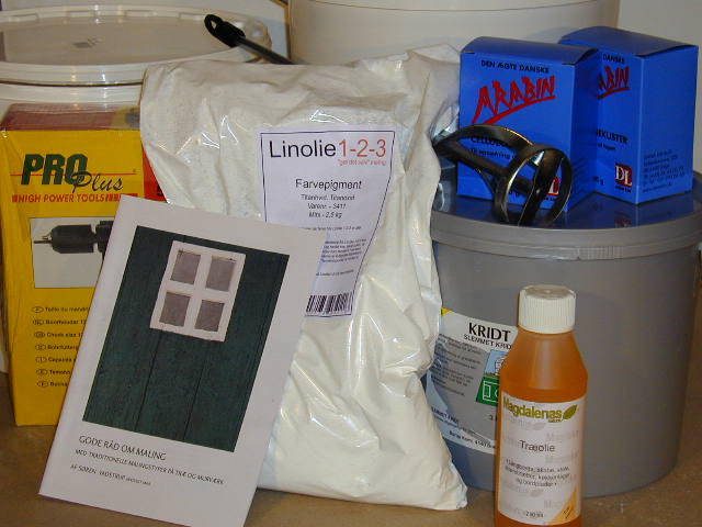 Malingen skal påføres jævnt og uden løbere, på en ren og fast overflade. Malingen påføres med en malerrulle eller en passende anstryger. Malingen er berøringstør efter ca. 2 timer - genbehandlingstør efter ca. 6 timer og gennemhærdet efter ca. 3 uger. Malingen vil, indtil den er gennemhærdet, afgive en svag duft af linolie (dufter lidt hen ad "kornmark"). Malingen rækker ca. 10 m² (pr. liter). Normalt skal malingen påføres 2 gange, for at overfladen er helt dækket. Lav evt. nogle prøve-opstrøg (til at starte med) - så resultatet (konsistens, strygbarhed, glans, dækkeevne, farvespil m.m.) kan bedømmes og vurderes i forhold til egne forventninger. Jo mere klister og linolie der tilsættes - jo mere glans og vaskbarhed tilføres malingen (men start som udgangspunkt med ovenstående anvisning). Hvis der ønskes en kraftigere binding af farvepigmentet - kan de overskydende 2 liter klister tilsættes malingen. Hvis der ønskes tyndere maling - kan malingen fortyndes med vand. Hvis der ønskes en superhvid ekstrem dækkende maling - erstattes de 3 kg slemmet kridt i opskriften blot med 2,5 kg titanhvid. Hvis malingen er blevet grynet eller klumpet - skyldes det sandsynligvis, at ovenstående anvisning ikke er blevet fulgt. Men fortvivl ikke - malingen kan sagtens "reddes" - malingen filtreres blot gennem en almindelig nylonstrømpe. Kaolin kaldes også Kina ler og porcelænsjord. Kaolin minder meget om pibeler - blot meget finere i kvaliteten. Kaolin, der er en meget fin og ren form for hvidt pibeler - kan erstatte brugen af slemmet kridt. Lav kun den mængde maling, der skal bruges, og undgå tilsætning af konserveringsmiddel (Atamon og citronsyre). | ||||||