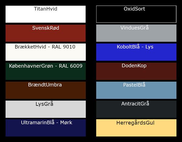 • Plantona findes i alle farver. Som de traditionelle og populære standard farver - og tonet efter eget farveønske (eksempelvis NCS farver, RAL farver eller efter opstrøg).