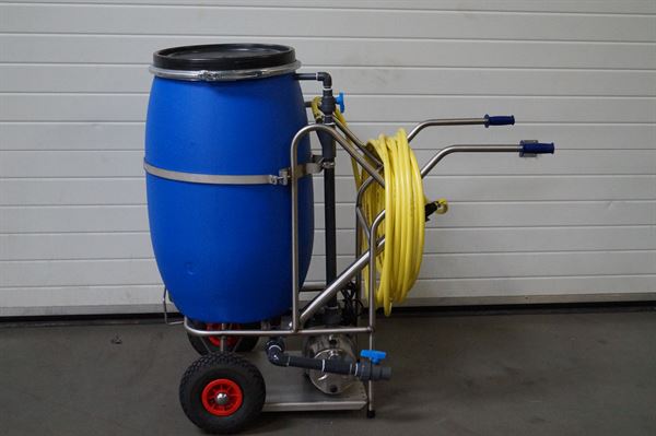 Sprøjtevognen er forsynet med 2 hjul. På vognen er der monteret 1 stk. beholder med et rumindhold på 120 liter, og 1 stk. pumpe på 1,2 HK (230 volt). 17 meter kraftig 1/2" slange.